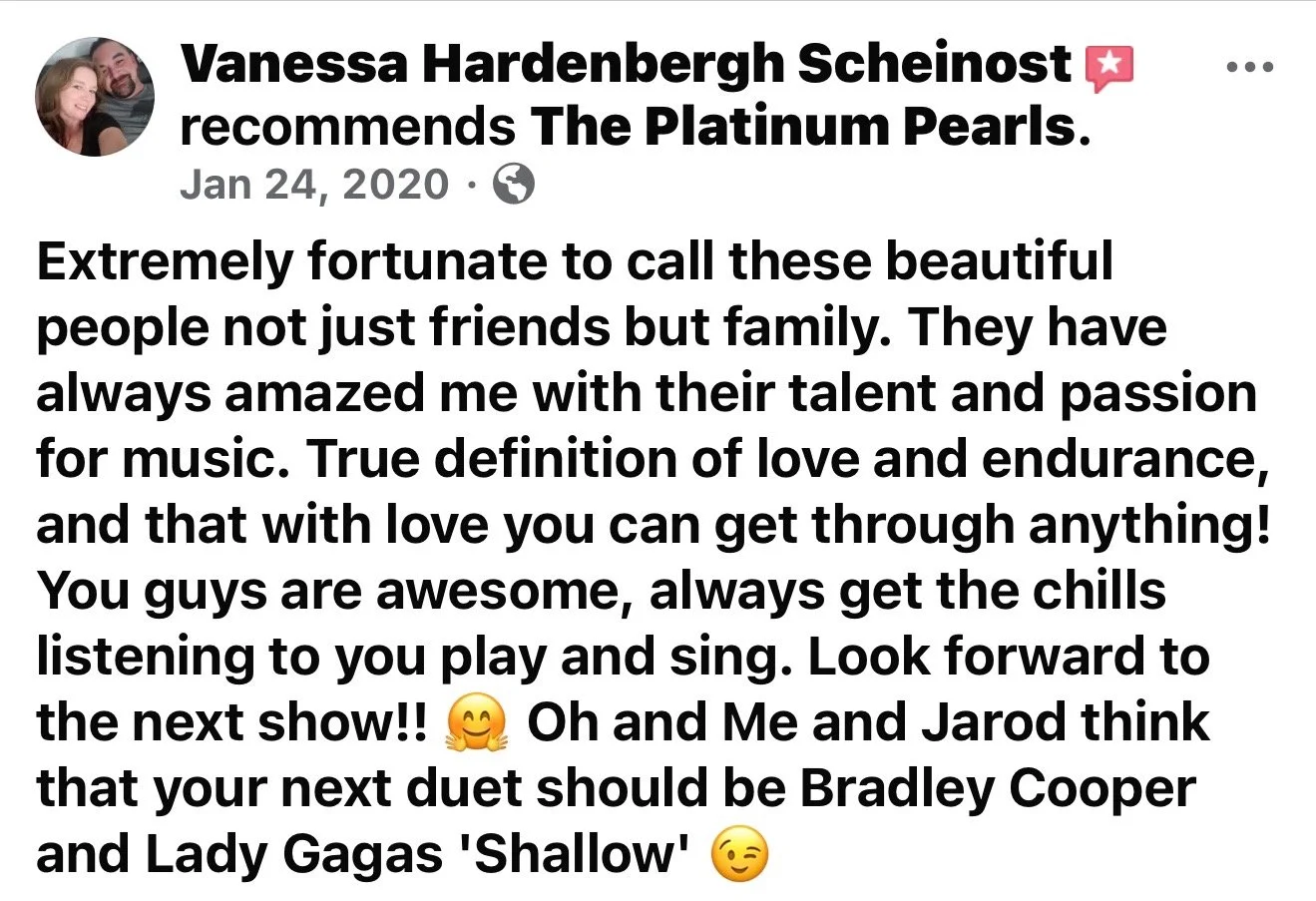 Tracey brings over 30 years of vocal and keyboard experience to The Platinum Pearls. She does double duty with playing the bass and keys, all while passionately singing music that touches your soul allowing you to feel the music. She belts out the hits you know and love with all her heart and soul.