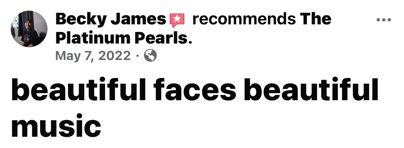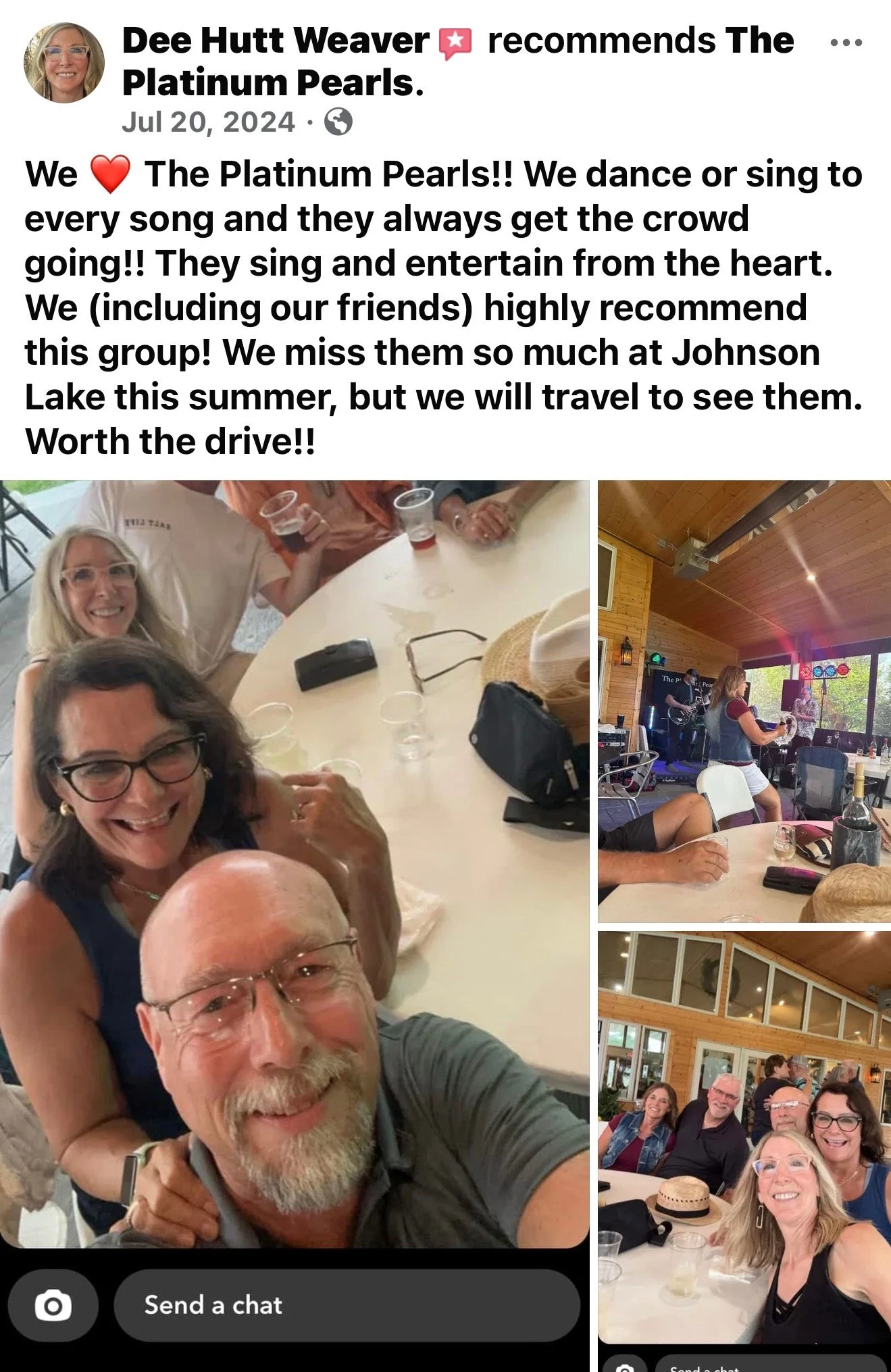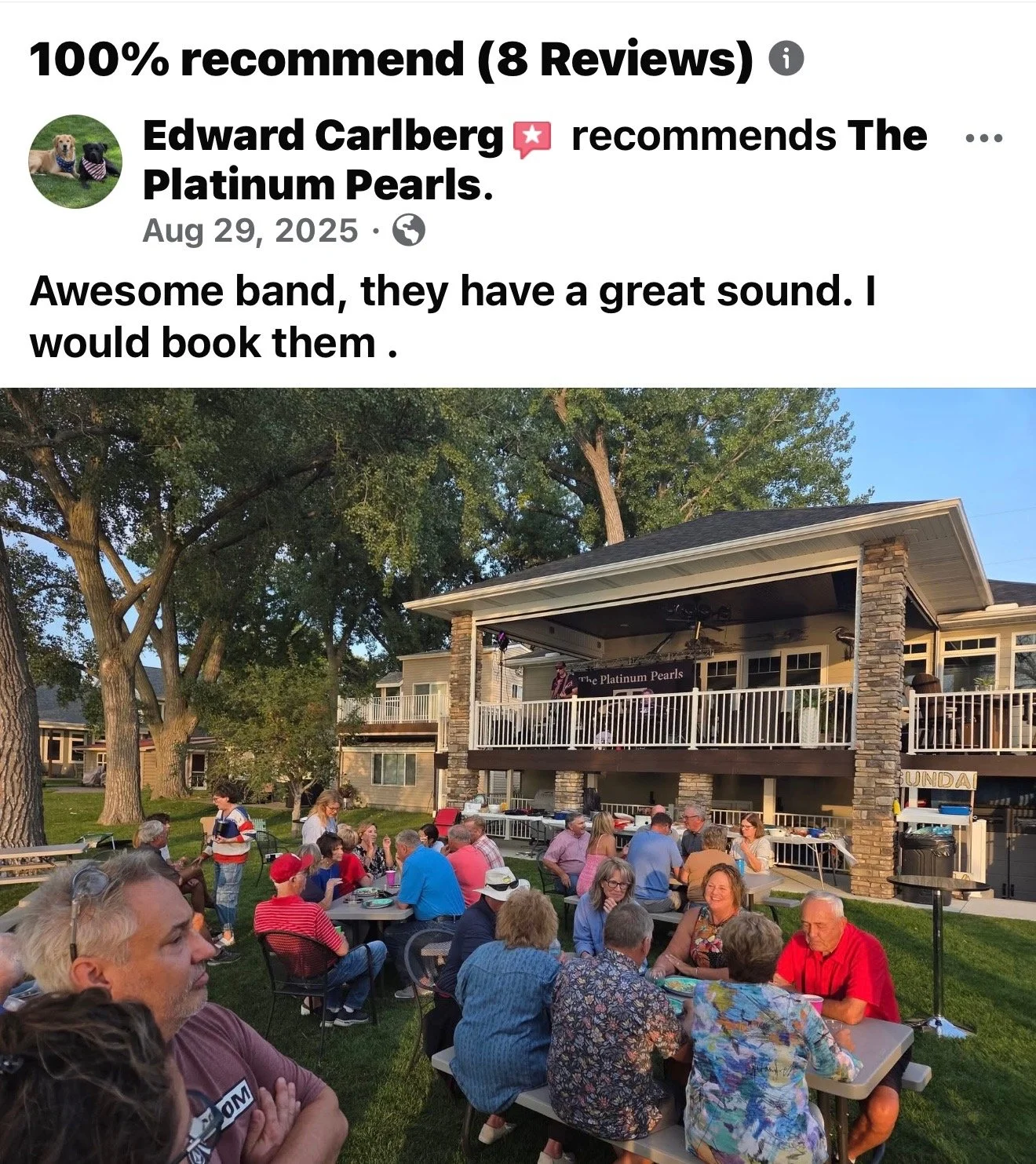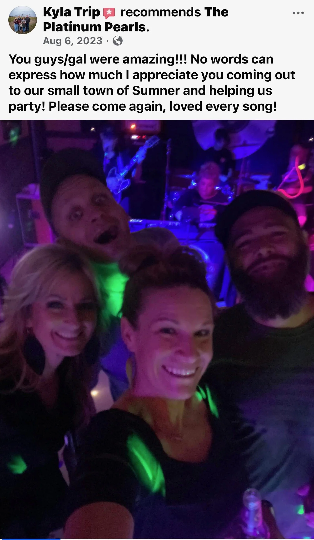 January 30 & 31, 2026Grand Island Casino 8:30pm to 12:30amEach NightFebruary 14, 2026Springlake Angus 9pm to 1amLynch, NEFebruary 27 & 28, 2026Gaslight Social 9pm - 1amCasper, WYMarch 13 & 14, 2026Lake Mac Casino 8pm - 12Ogallala, NEMarch 21, 2026Evynrudes 8pm Wolbach, NEMarch 28, 2026Fonner Park5:30pm Grand Island, NEThe Platinum Pearls Experience!